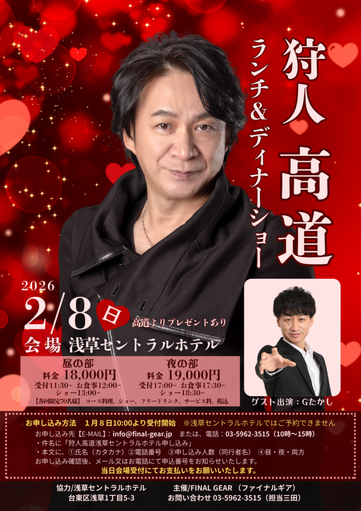 2026年1月7日 / 最終更新日 : 2026年1月7日 tokuoka お知らせ 2/8 高道 ランチ&ディナーショー 開催決定!! 2026/2/8(日)狩人高道 ランチ&ディナーショー浅草セントラルホテル